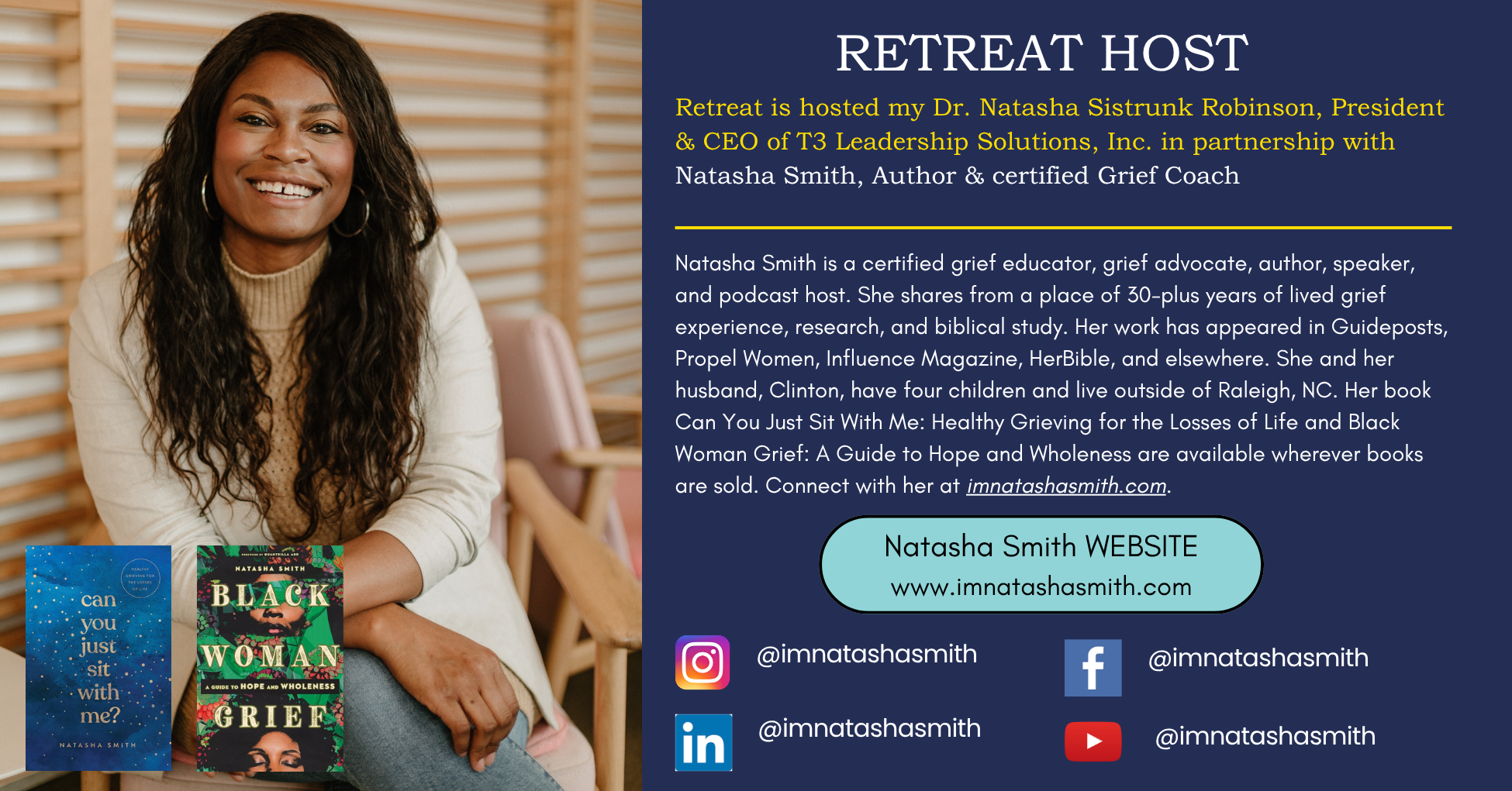 The retreat will be co-hosted by authors and leadership expert, Dr. Natasha Sistrunk Robinson, and certified Grief Educator, Mrs. Natasha Sistrunk, with the intentional purpose of supporting you and the community on your grief and leadership journey with practical tools, techniques, and support. We will engage the community in guided practices and allow space for your personal reflection, clarity, rest, creativity, and fun.